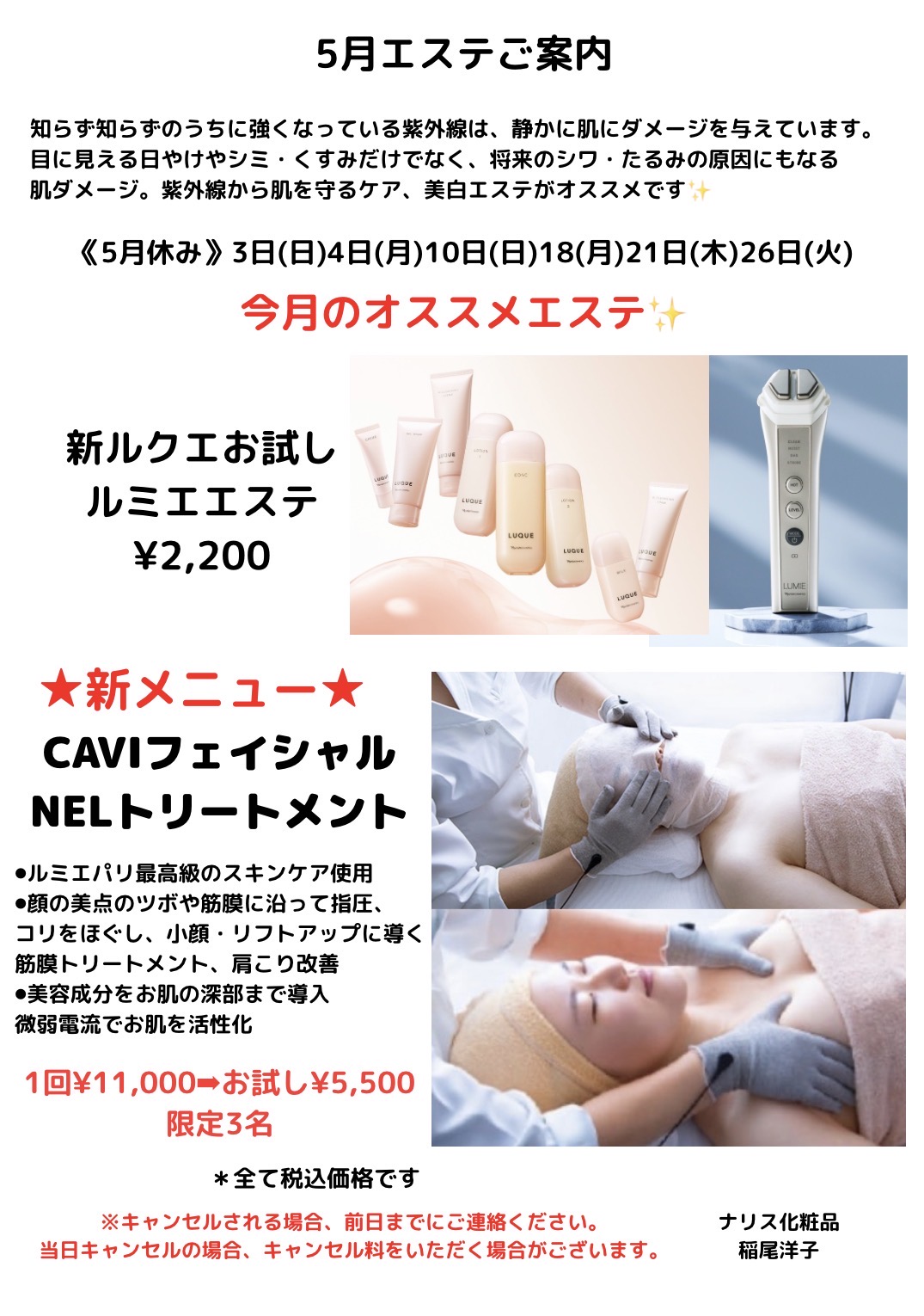 5月もみなさまのお肌を綺麗にメンテナンスいたします。