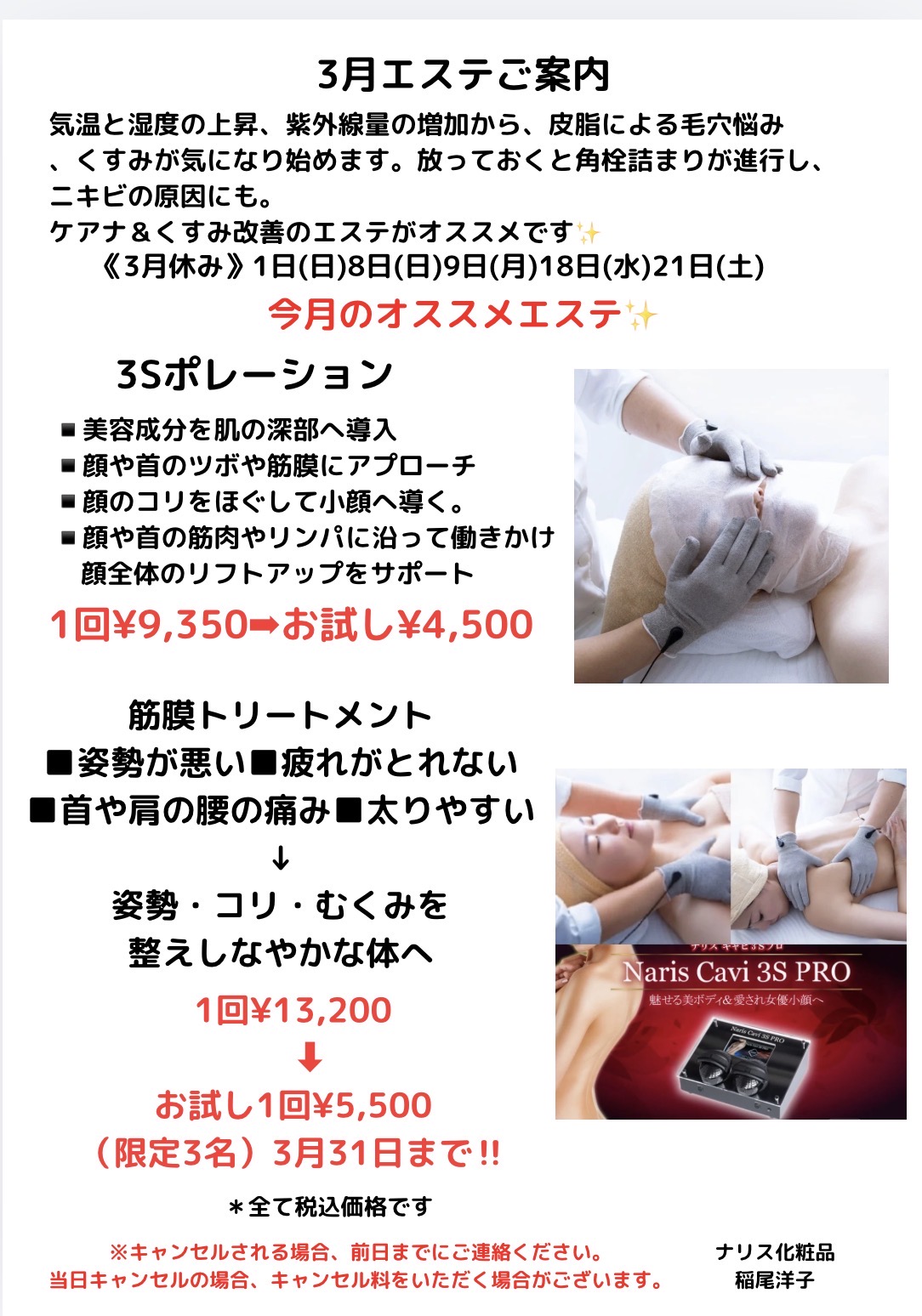 3月もみなさまのお肌を綺麗にメンテナンスいたします。