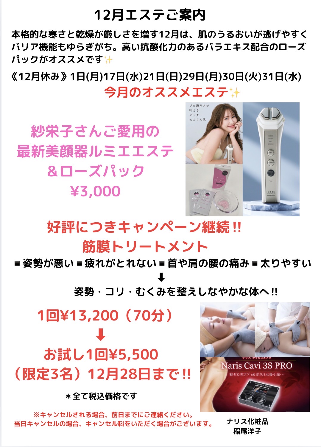 12月もみなさまのお肌を綺麗にメンテナンスいたします。