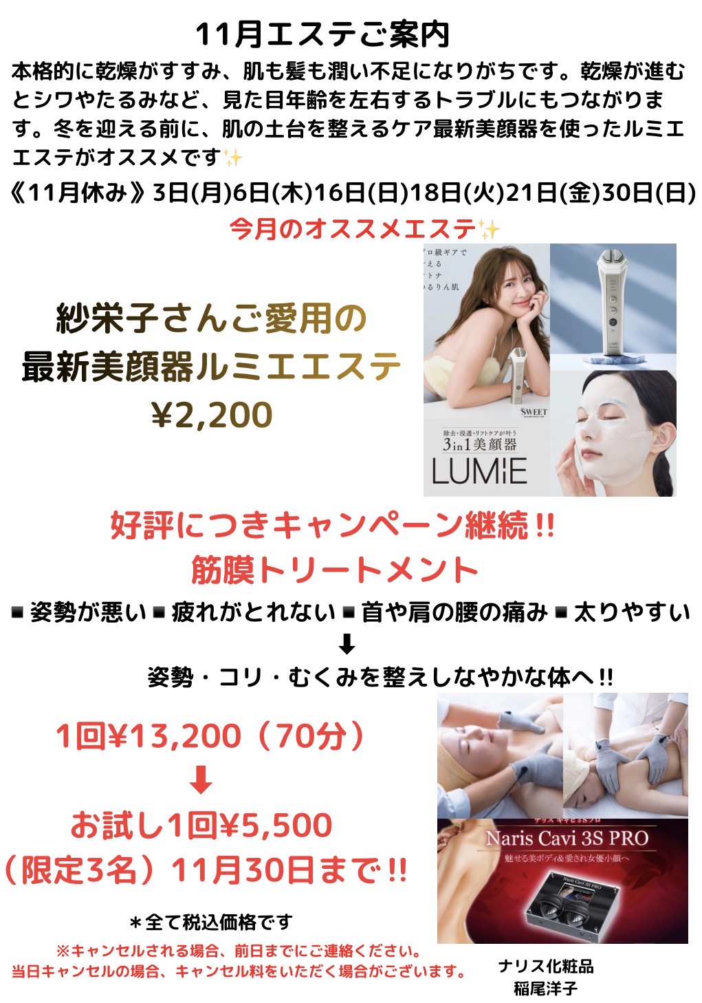 11月もみなさまのお肌を綺麗にメンテナンスいたします。